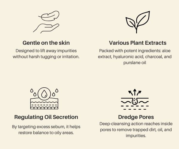 Our advanced formula harnesses the power of activated charcoal and purslane oil to draw out impurities, excess oil, and debris that clog your pores. This deep-cleansing action banishes blackheads and leaves your skin visibly smoother—all without stripping natural moisture.